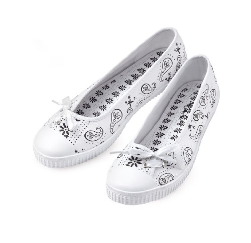 Finally...a flat shoe with sass. This canvas shoe with the rubber soles and ribbon tie is just enough casual, with a touch of dress. Picture those designer jeans with this flirty ballet flat. Won't you be the envy of the party? This is the perfect designer inspired shoe with flower and ivy designs and patterns on the fabric. It's a closed-toe womens casual shoe that will go with all of your outfits. This shoe has the shape of a ballet flat with the feel of a sneaker to add a little attitude.